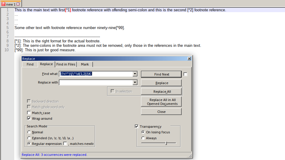 Notepad++ Regex Replace Makeshift Footnotes format With Proper Markdown format
