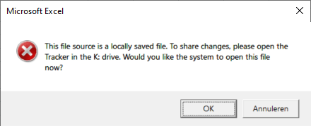 MsgBox "This file source is a locally saved file. To share changes, please open the Tracker in the K: drive." _