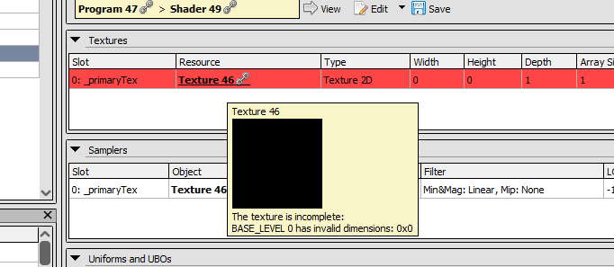No matter what i try , i cant seem to make the quad show any textures, tried with solid color in the fragshader works fine, tried drawing the gradient tex coords worked fine .. as soon as i introduced a sampler and tried setting the texture it wasnt working… attached some code and debugging details below
