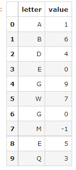df = pd.DataFrame({"letter":['A','B','D','E','G','W','G','M','E','Q'],'value':[1,6,4,0,9,7,0,-1,5,3]})
