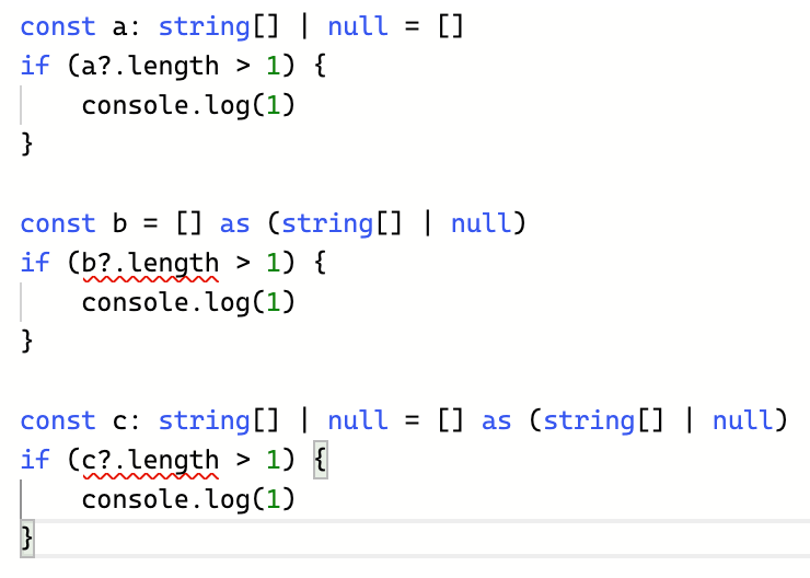 I am experiencing some weird behaviour in TypeScript (v4.6.2). Why does (a) work but (b) and (c) don’t?
