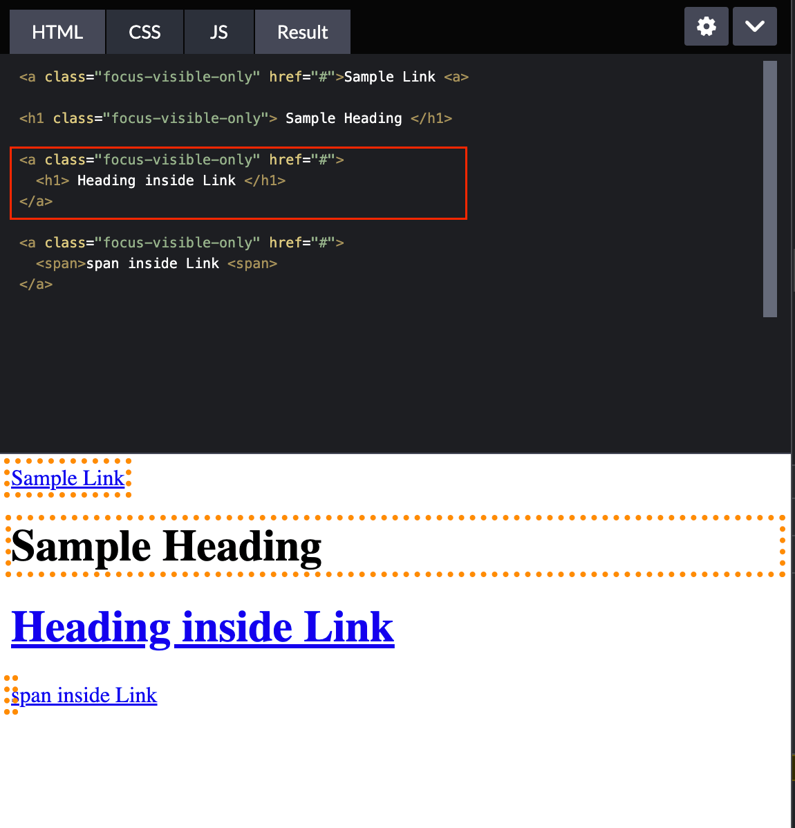 I added outline: 4px dashed darkorange; for focus-visible of parent anchor tag.