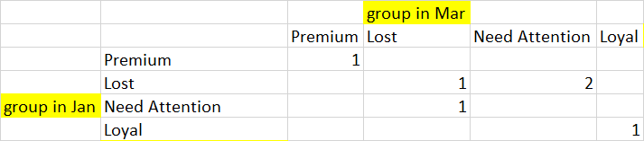 Is there anyway to capture their movement from one group another between the months Jan and Mar? I have a big data of 20K customers. Is there any elegant way to produce the below output?