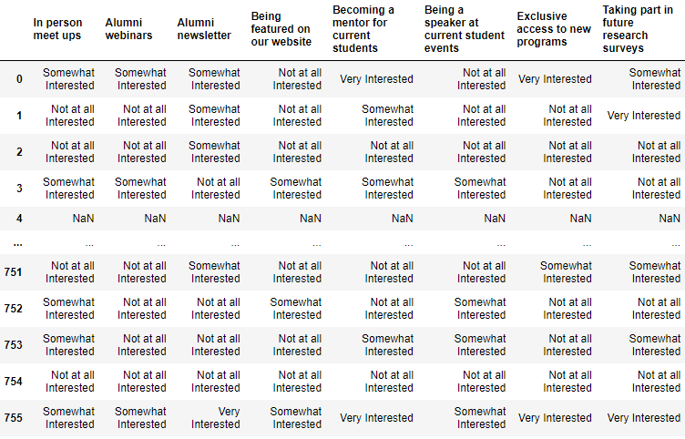 The unique values are [‘Somewhat Interested’, ‘Not at all Interested’, nan,’Very Interested’]
