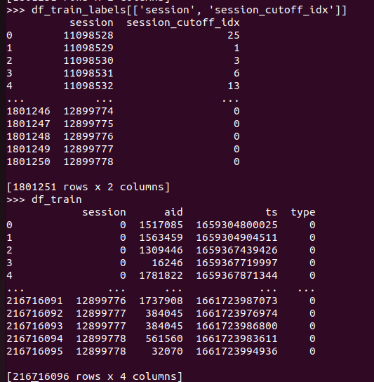I have two dataframes. One of them has session ids and their cut-off points. The other dataframe has multiple rows for each session and I want to take first n rows of each session and n is the cut-off point from the other dataframe. This is a screenshot of two dataframes.