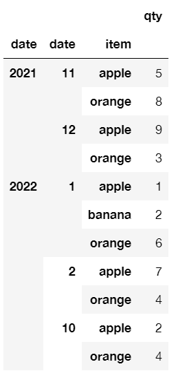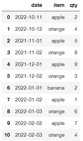 df = pd.DataFrame(columns=["date", "item", "qty"], data=[['2022-10-11','apple',2],['2022-10-12','orange',4],['2021-11-01','apple',5],['2021-11-02','orange',8],['2021-12-01','apple',9],['2021-12-02','orange',3],['2022-01-01','banana',2],['2022-01-02','apple',1],['2022-01-03','orange',6],['2022-02-02','apple',7],['2022-02-03','orange',4]])
