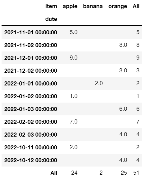 pd.pivot_table(df, values='qty', index='date', columns='item', aggfunc='sum', fill_value='', margins=True)