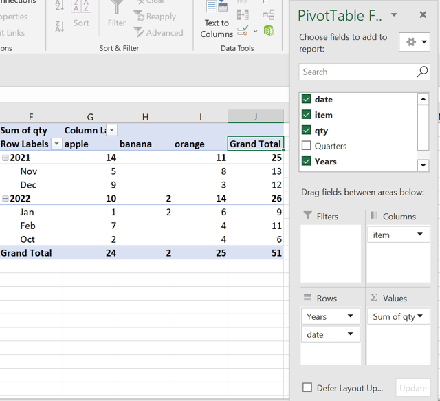 I would like to group rows into Years and Months, and items into columns, with row and column subtotals. Using an Excel pivot table, it would be done as so: