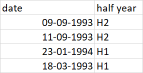 df['half year'] = np.where(df['date'].dt.month.le(6), 'H1', 'H2')