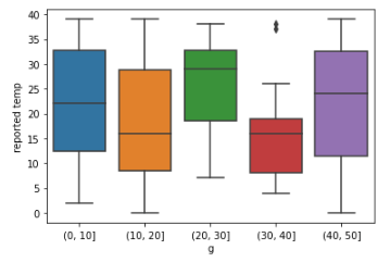 ax = sns.boxplot(x=temp3['g'], y=temp3['reported temp'])