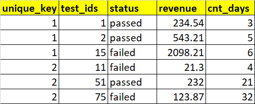 unique_key test_ids status revenue cnt_days
