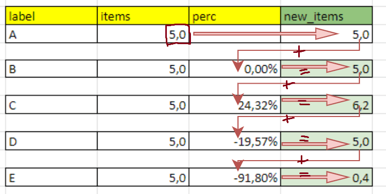 You need to compute the cumulated percentage by dividing by 100, adding 1 and computing the cumprod, then multiply by "items":