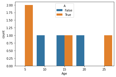 How can I make a bar chart plot which has the values of the total number of rows in age, so for example 7 as the Y axis and the age as the X axis, with each Age having a true/false bar plot. I would like something like this, however instead of it saying gender F/M, it does True/False, for each age range.