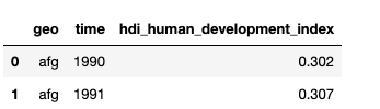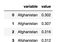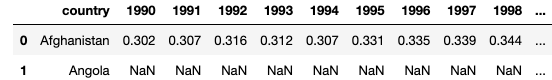 df.set_indexon columncountryand applydf.unstackto add the years from the column names to the index. - Now, we use