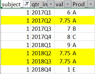 I expect my output to be like as below for subject_id = 1. Here yellow color shows newly inserted rows (to fill the missing gaps)