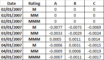 I would like to find a solution which will subtract the values for each column and rating for consecutive days. Say, the change in A from 03/01/2007 to 02/01/2007 for rating M would be 0.4179 - 0.4256 = -0.0077. The subtraction won’t always be performed on a one day difference. But it will always be the (new date – the old date).