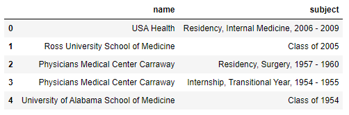 1: "[{'name': 'USA Health', 'subject': 'Residency, Internal Medicine, 2006 - 2009'}, {'name': 'Ross University School of Medicine', 'subject': 'Class of 2005'}]",