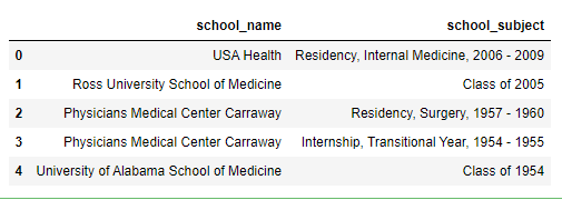 2: "[{'name': 'Physicians Medical Center Carraway', 'subject': 'Residency, Surgery, 1957 - 1960'}, {'name': 'Physicians Medical Center Carraway', 'subject': 'Internship, Transitional Year, 1954 - 1955'}, {'name': 'University of Alabama School of Medicine', 'subject': 'Class of 1954'}]"