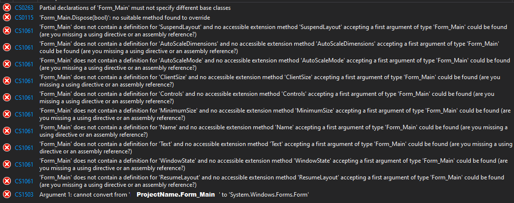 Your main problem is the first error printed: You cannot declare different base classes in different partial implementations. I don’t know which of the two base classes is the right one (the one you previously used), but as always, a class cannot have two base classes. It is legal to specify the base class only in one of the parts, but if it is specified multiple times, it must be the same.
