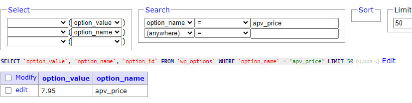 $priceQuery = "SELECT `option_value` FROM {$wpdb->prefix}`options` WHERE `option_name` = 'apv_price'";