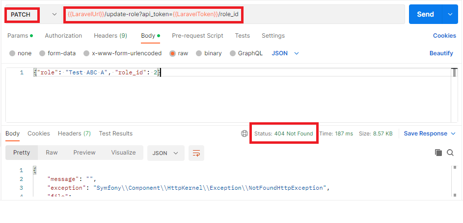I am using Laravel 8. There is a patch route. I am trying to submit the patch request through postman. Due to some reasons it shows 404 response.