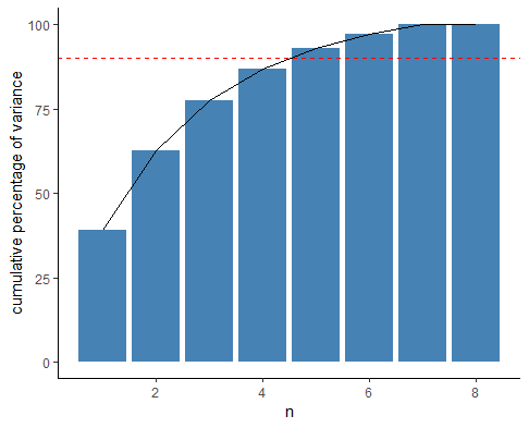 ggplot(aes(x = n, y = `cumulative percentage of variance`)) +