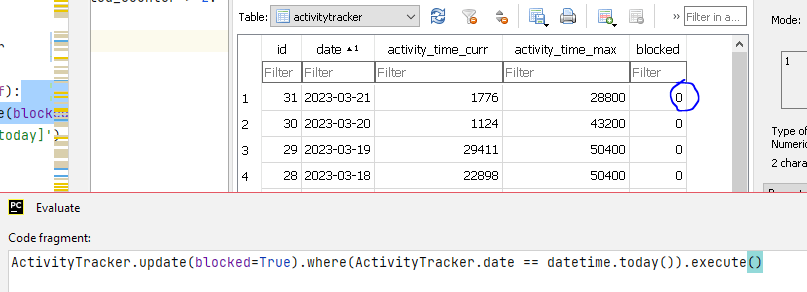ActivityTracker.update(blocked=True).where(ActivityTracker.date == datetime.today()).execute()