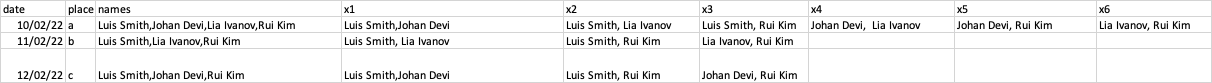"2022-02-11", "b", "Luis Smith,Lia Ivanov,Rui Kim", "Luis Smith, Lia Ivanov", "Luis Smith, Rui Kim", "Lia Ivanov, Rui Kim" , NA,NA,NA,