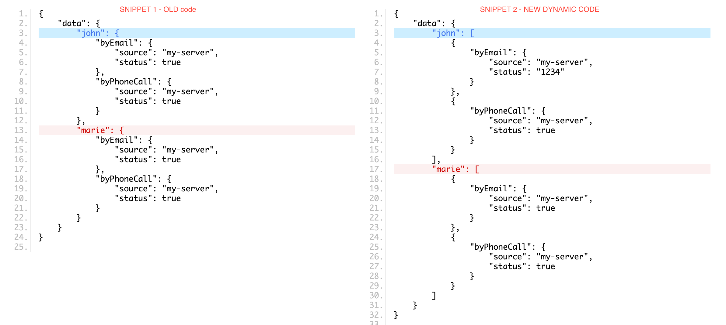Code snipppet 1: Old JSON code generated from php array