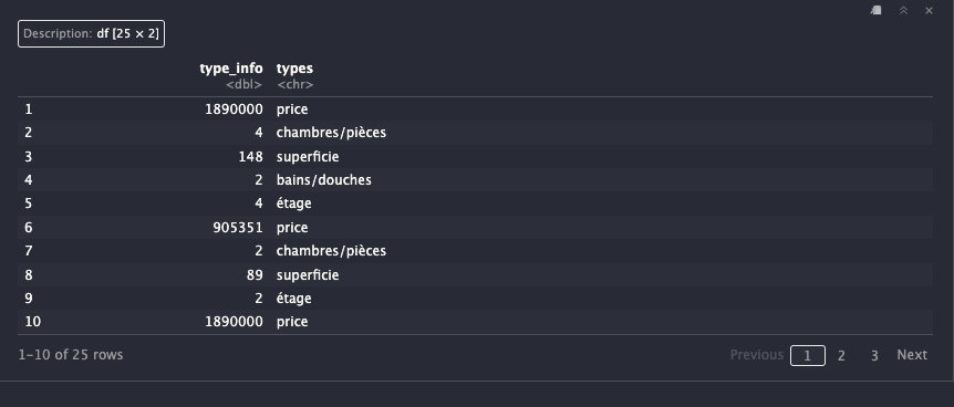 I have this dataframe from data I scraped. I wanted to pivot_wider but doing that shifts data down. This might be due to the types column having differents lengths of unique values (eg. price appears 12 times and étage 6 times) but I can’t seem to find a way to do what I want it to do.