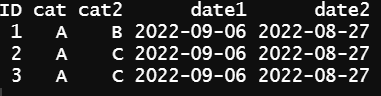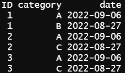 Create a row sequence by ‘ID’, use the sequence column as names_from and values_from as ‘category’ and ‘date’ in the pivot_wider