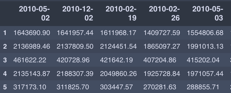 Here is what a subset of the df (called df_wide) looks like: Rows are Store Numbers, Columns are Dates, Values are Total Sales