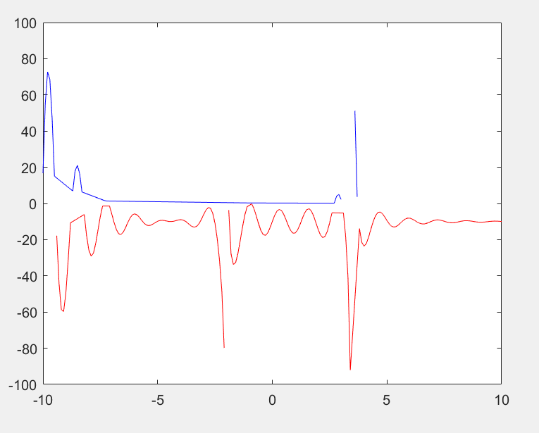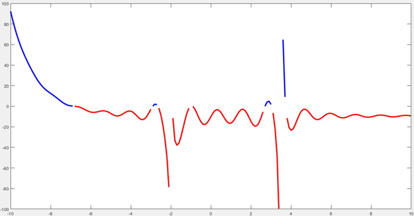 Here I’ve plotted ((2*x.^2+3*exp(-x) -(100*a)).*sin(5*x))./(6*x.^2-9*x-42)-10 with input a=3, dx=0.1.