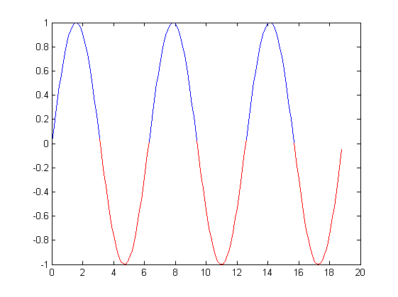 You can make two arrays: neg_x = x; neg_x (neg_x >0) = nan plot using 'r' and then the opposite for the positive values. This will, however, leave you with the pieces between the two arrays, i.e. your gaps. You can correct them by finding them and extending the index by one: