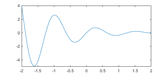 fplot(@(t)exp(-t).*sin(5*t),[-2,2])