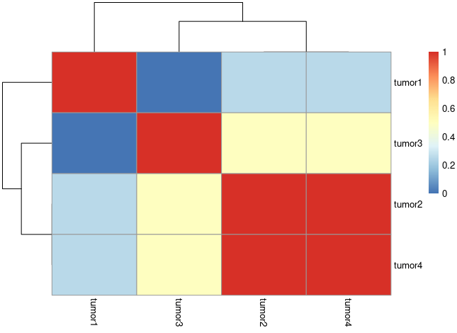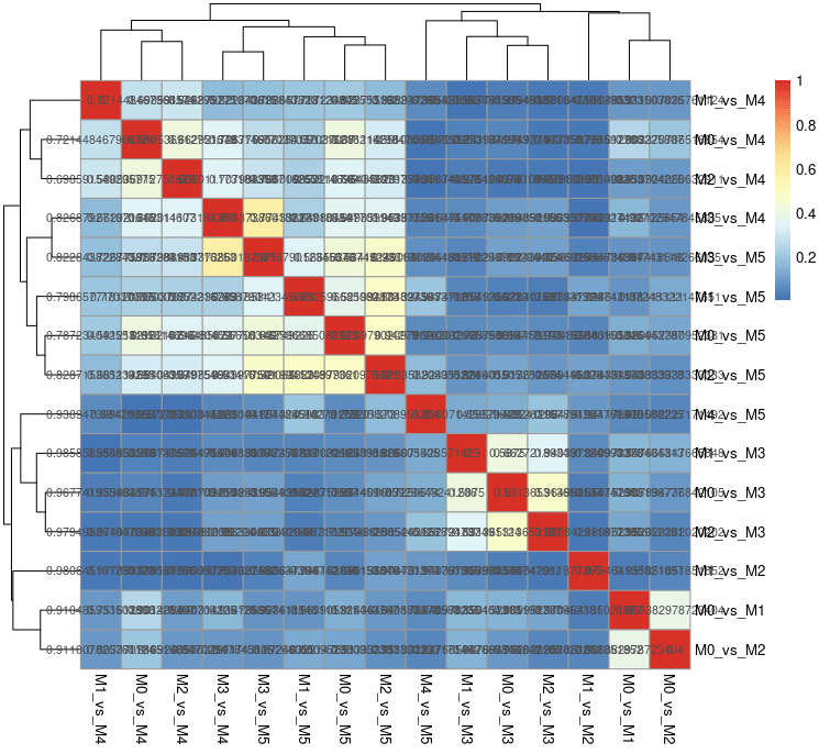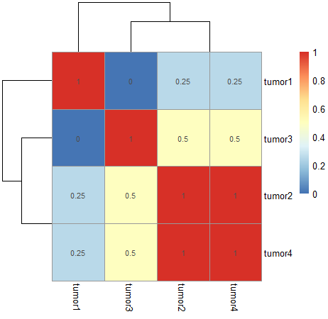 pheatmap(1-as.matrix(D1), display_numbers = 1-as.matrix(D1))