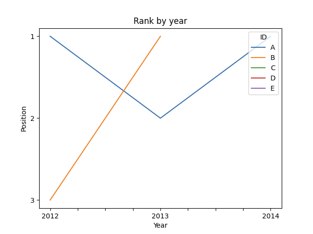 ax = piv.plot(xlabel='Year', ylabel='Position', title='Rank by year')