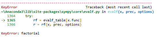 You are using sympy’s factorial on numerical data types: if possible, avoind mixing symbolic functions with numerical data.