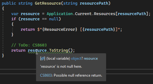 I have a problem resolving this CS8603 warning. Even though there is a null-check for resource variable, null reference is still possible. How come?