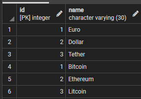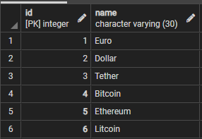 CREATE TABLE IF NOT EXISTS crypto (id INT default nextval('n_id') PRIMARY KEY) INHERITS (currency);