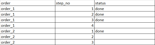 i would like to query for all the records where status = null, but the status of the previous step_no is "done" group by the order.