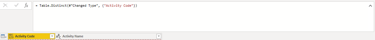 = Table.Distinct(Source,{{"Activity", Comparer.Ordinal}, {"Activity ID", Comparer.OrdinalIgnoreCase}} )