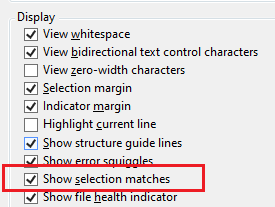editing.When it’s checked, any time you select something in your editor, anywhere else that exact string occurs will be subtly highlighted both in the editor and in the scrollbar.