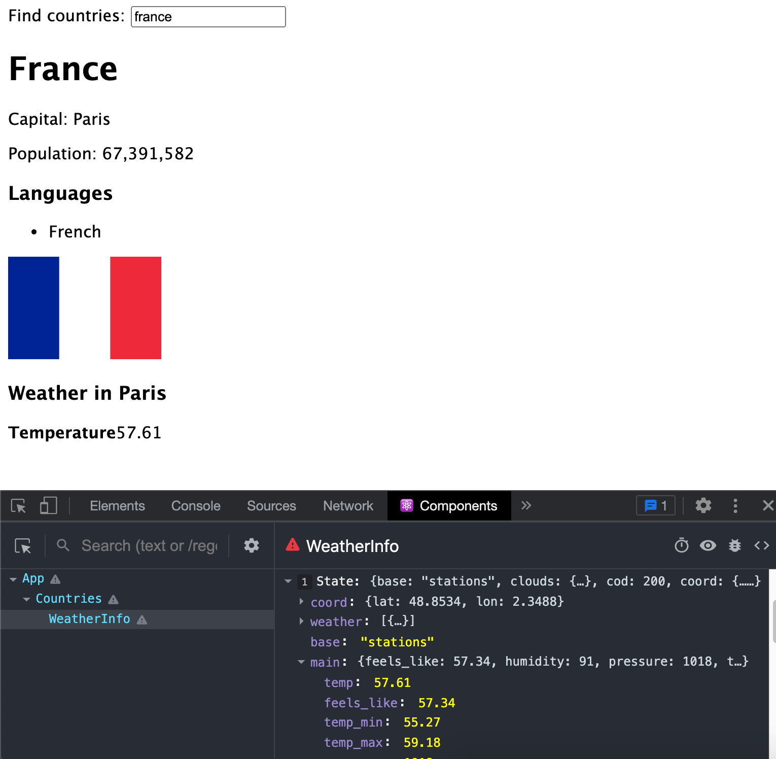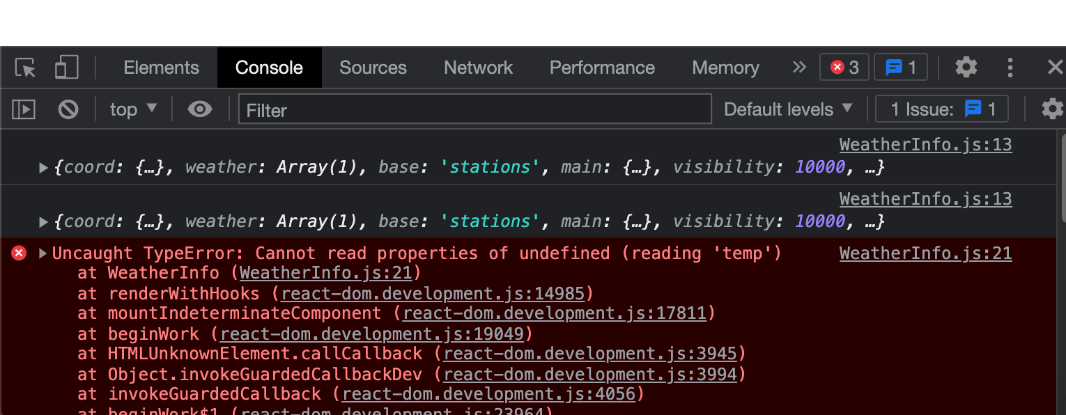 Currently, I am only able to pull information when the name of the country is already loaded, I add the code, save it, then it’s updated on localhost. But when I type in another country I get the error of Uncaught TypeError: Cannot read properties of undefined (reading 'temp'). For example, my code {weather.main.temp} works but only when the state = "france" is already set before.