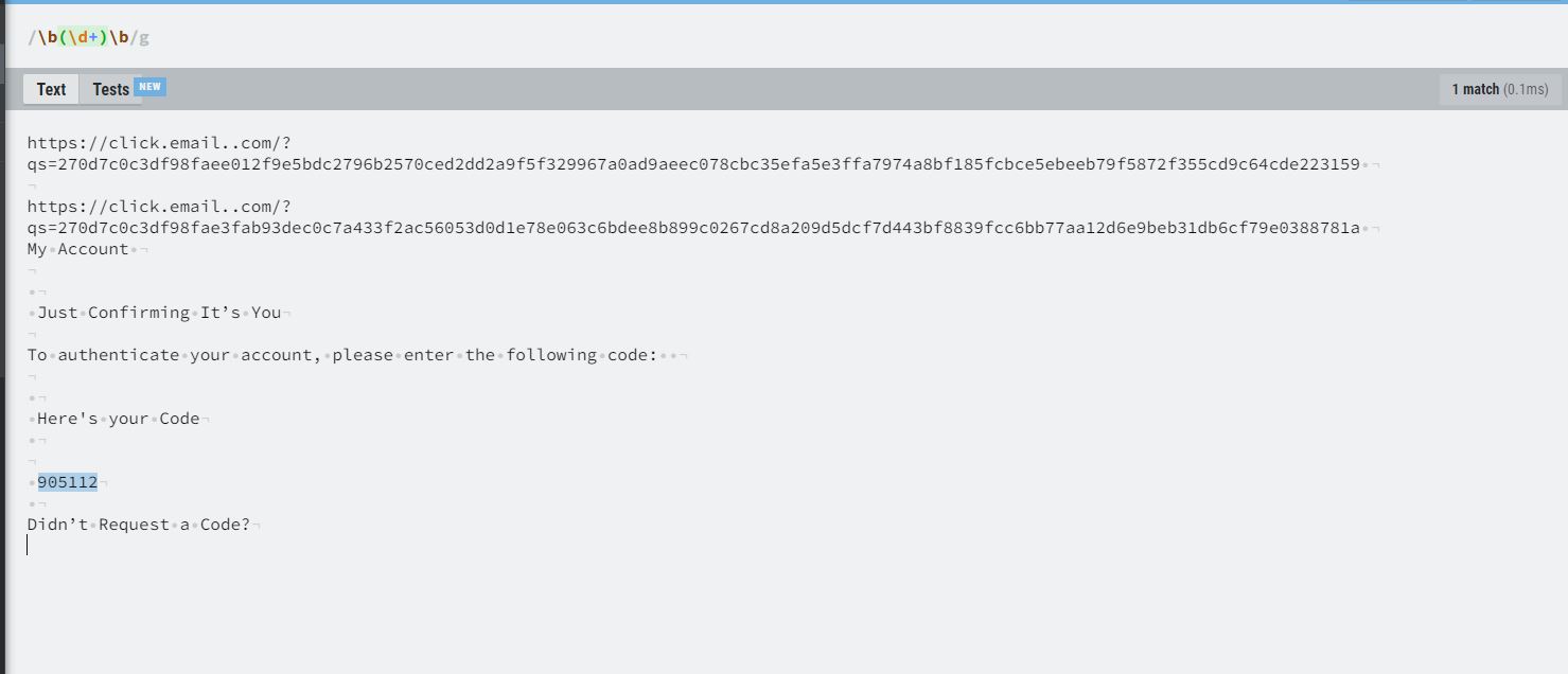 I am trying to pull a 6 digit number(authentication code)between white space from the email body into a google sheet. "date, sender, and subject" are all populating in the google sheet correctly except "body", which is populating " [Ljava.lang.Object;@6f90342a ". Here is my full code and a screenshot of the email body.