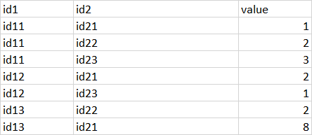 df = spark.createDataFrame([('id11', 'id21', 1), ('id11', 'id22', 2), ('id11', 'id23', 3), ('id12', 'id21', 2), ('id12', 'id23', 1), ('id13', 'id23', 2), ('id13', 'id21', 8)], ["id1", "id2","value"])