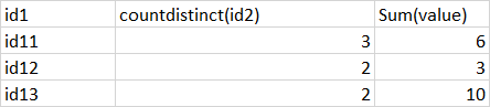 | id1|count(id2)|sum(value)|