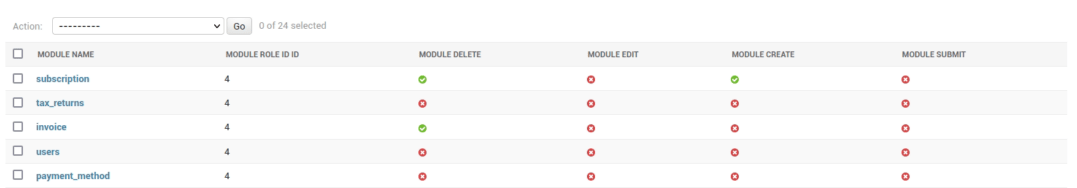 list_display = ('module_name', 'module_role_id_id', 'module_delete', 'module_edit', 'module_create', 'module_submit')
