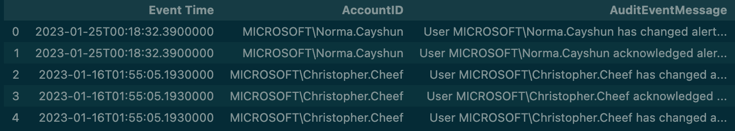result = {'results': [{'Event Time': '2023-01-25T00:18:32.3900000', 'AccountID': 'MICROSOFT\\Norma.Cayshun', 'AuditEventMessage': 'User MICROSOFT\\Norma.Cayshun has changed alert note SOUTHBAY-VM2 13.107.136.45 has rebooted. [].'}, {'Event Time': '2023-01-25T00:18:32.3900000', 'AccountID': 'MICROSOFT\\Norma.Cayshun', 'AuditEventMessage': 'User MICROSOFT\\Norma.Cayshun acknowledged alert SOUTHBAY-VM2 13.107.136.45 has rebooted..'}, {'Event Time': '2023-01-16T01:55:05.1930000', 'AccountID': 'MICROSOFT\\Christopher.Cheef', 'AuditEventMessage': 'User MICROSOFT\\Christopher.Cheef has changed alert note Server Node Down on NORTHLOBBY-VM5 [].'}, {'Event Time': '2023-01-16T01:55:05.1930000', 'AccountID': 'MICROSOFT\\Christopher.Cheef', 'AuditEventMessage': 'User MICROSOFT\\christopher.Cheef acknowledged alert Server Node Down on NORTHLOBBY-VM5.'}, {'Event Time': '2023-01-16T01:55:05.1930000', 'AccountID': 'MICROSOFT\\Christopher.Cheef', 'AuditEventMessage': 'User MICROSOFT\\Christopher.Cheef has changed alert note SOUTHBAY-VM2 13.107.136.45 has rebooted. [].'}]}