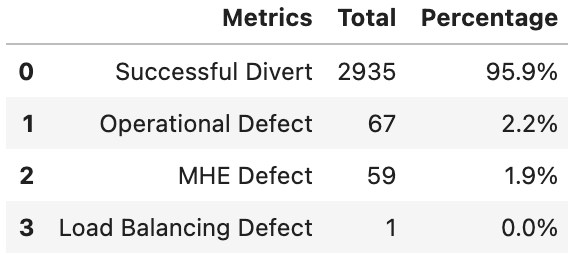 "total percentage,Successful Divert 2935 95.9%,Operational Defect 67 2.2%,MHE Defect 59 1.9%,Load Balancing Defect 1 0.0%"